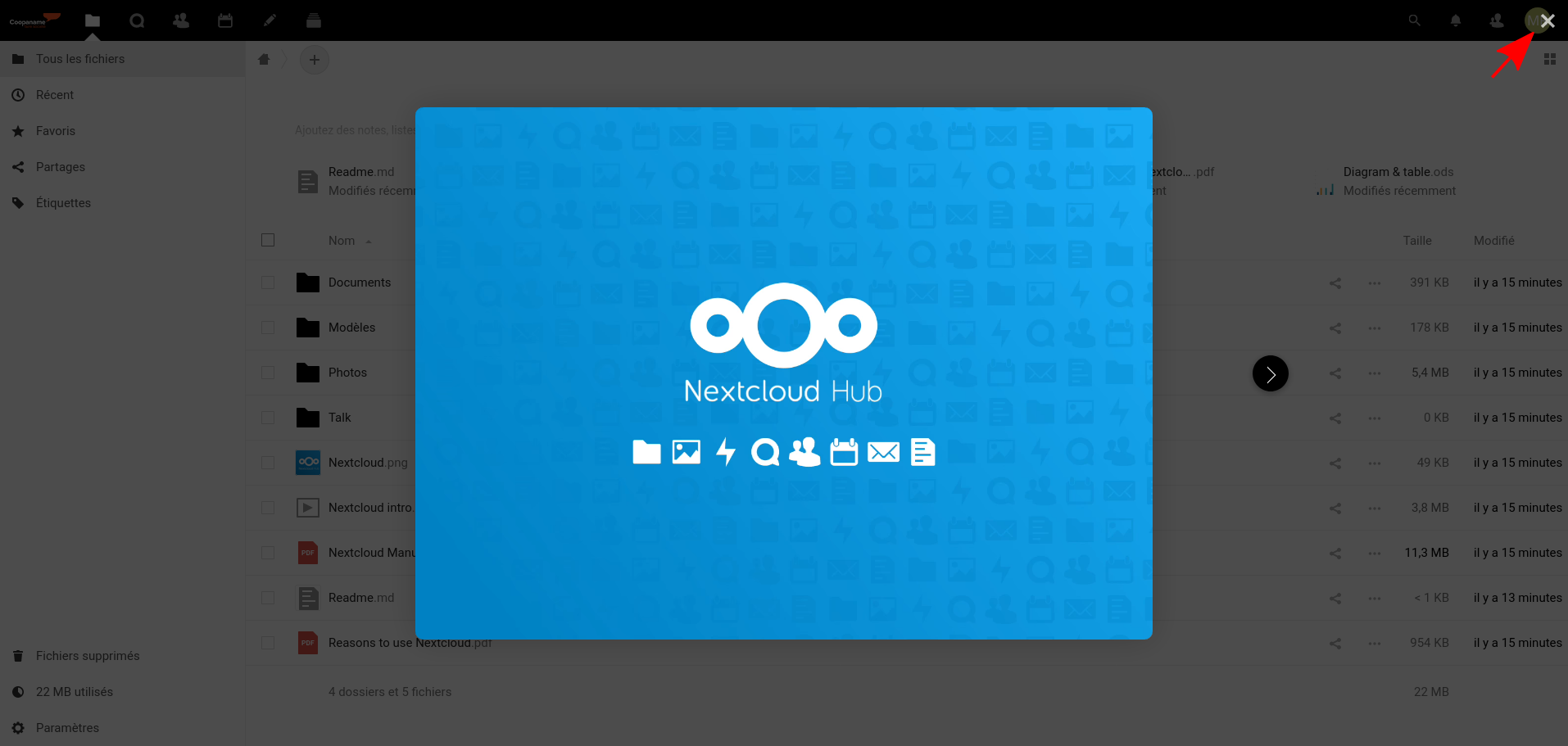 Lorsque vous vous connectez pour la première fois, vous êtes accueilli·e par une bannière de présentation de Nextcloud. Vous pouvez cliquer sur la flèche pour visionner les 3 diapositives ou cliquer sur la croix pour la fermer.