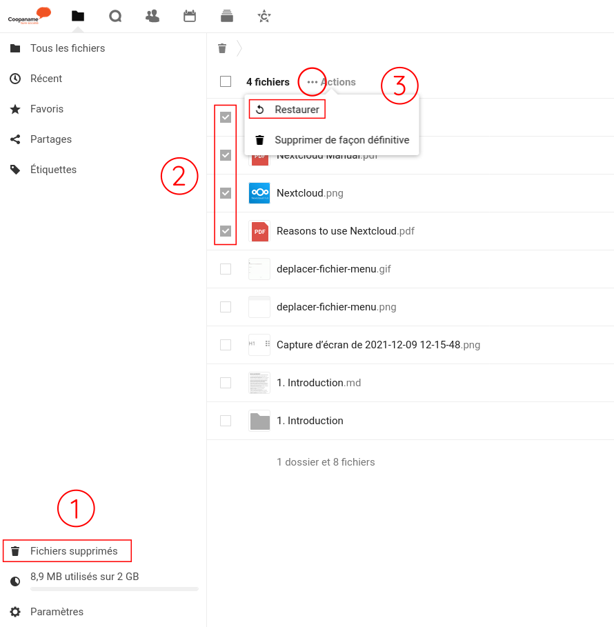 Cliquez sur "Fichiers supprimés" en bas à gauche de l'interface.