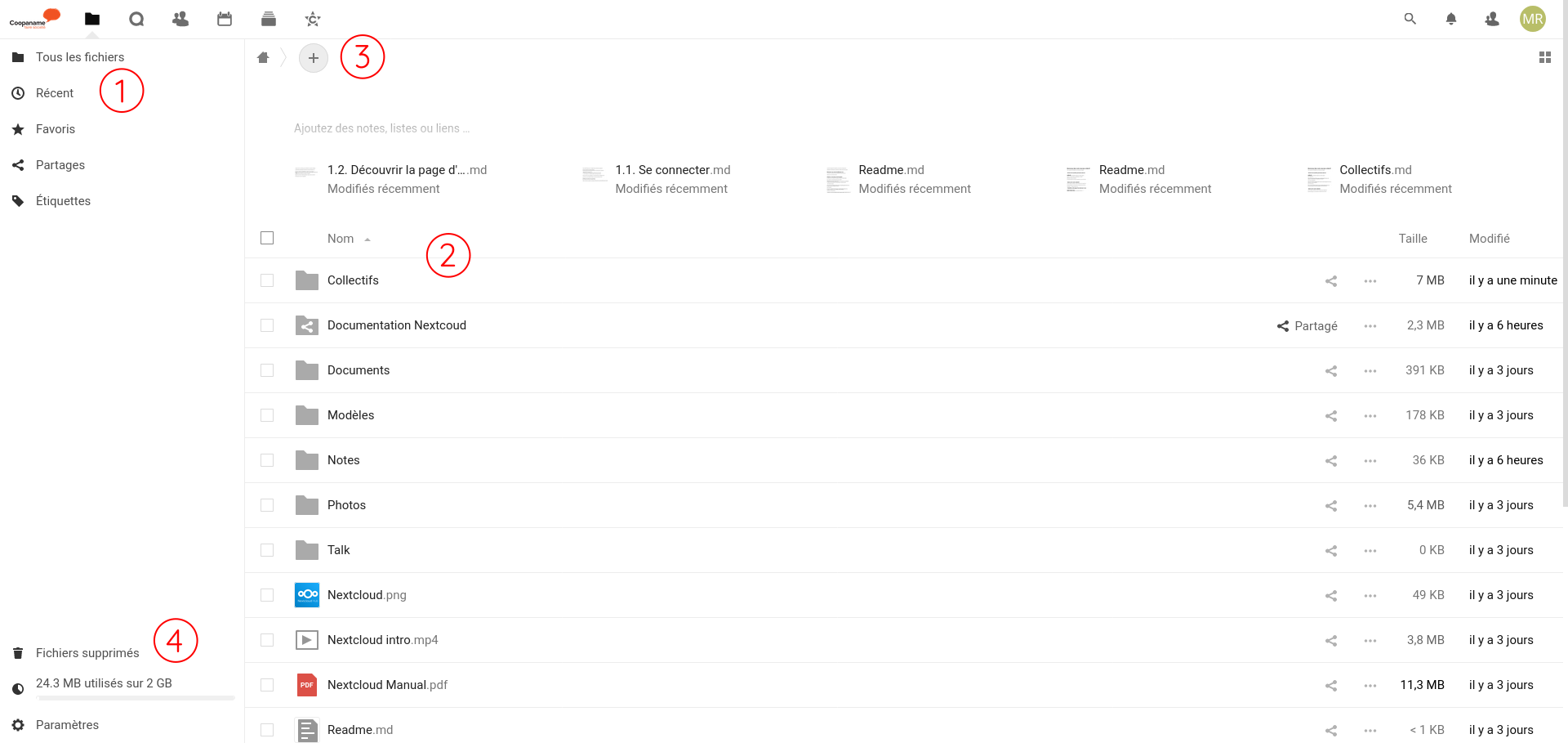 1. Le menu de gauche permet de filtrer l'affichage. "Tous les fichiers" permet de parcourir l'arborescence générale.