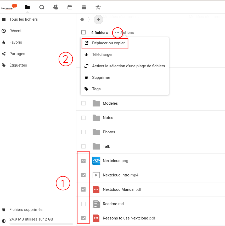 - Cochez les fichiers à copier ou déplacer dans la liste des dossiers.