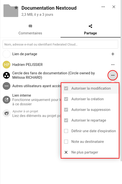 Par défaut, les destinataires d'un partage interne ont la possibilité de modifier et repartager le contenu du document ou du dossier partagé. Il est possible de modifier ces autorisations.