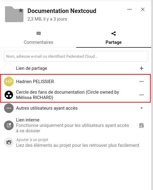 Une fois le partage effectué, les destinataires retrouvent le document ou le dossier dans leur espace personnel. Il est aussi possible de leur communiquer un lien interne, permettant l'accès direct. Pour générer ce lien :