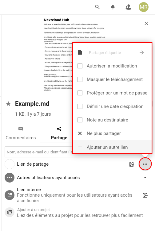 - Ajouter un autre lien : créer un deuxième lien de partage (utile pour avoir des liens avec des autorisations différentes).