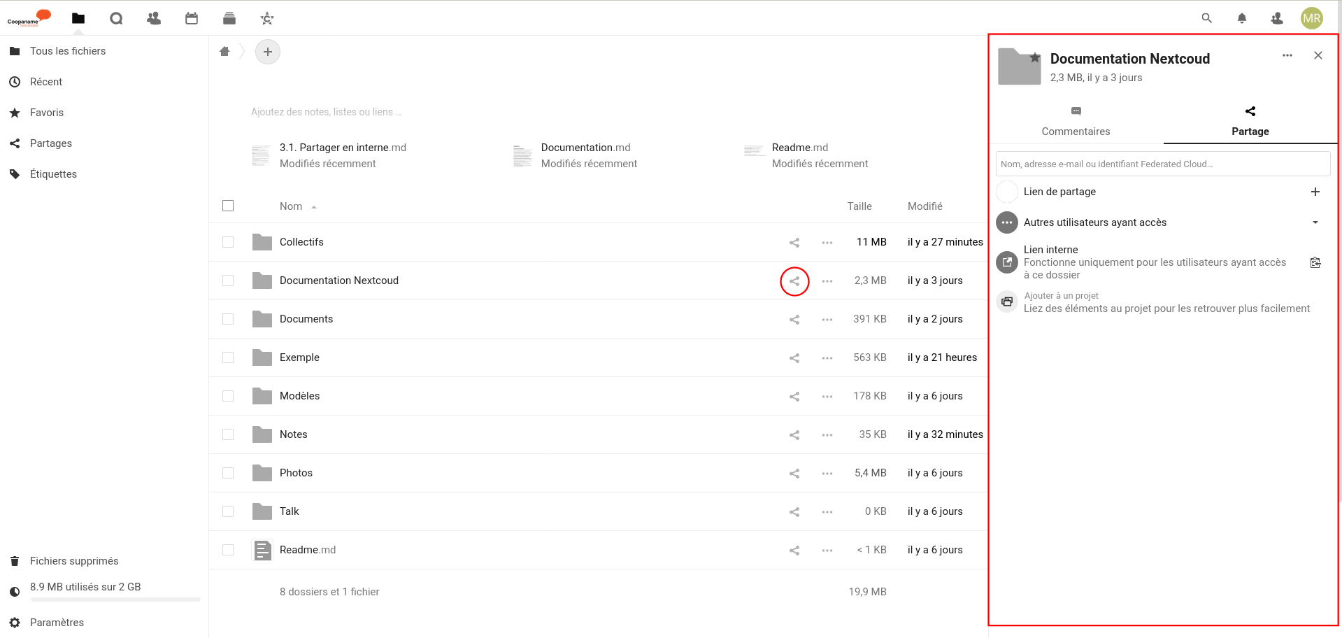 Pour rendre un contenu public (accessible sans compte sur votre instance Nextcloud)** :
