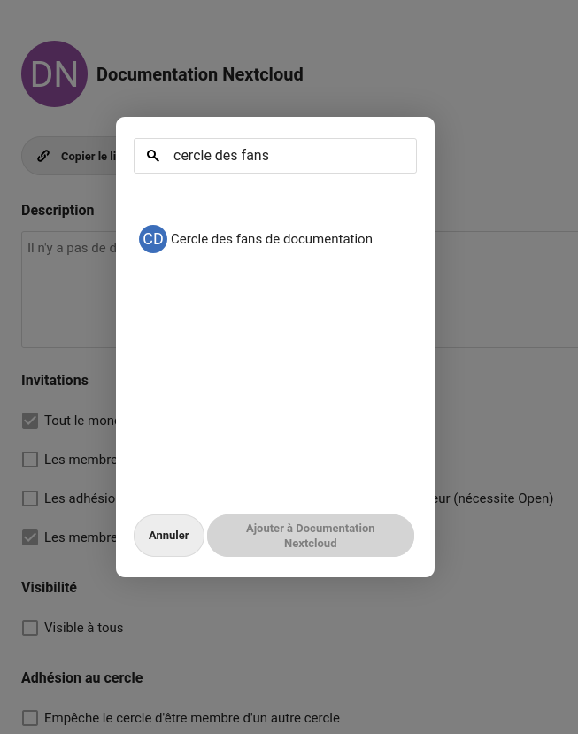 Visible à tous : le cercle apparaît dans la liste de contacts de tous⋅tes les utilisateur⋅ices, ainsi que dans la fonction recherche. Si la case est décochée, seul⋅es les membres du cercle le verront apparaître dans leur liste.