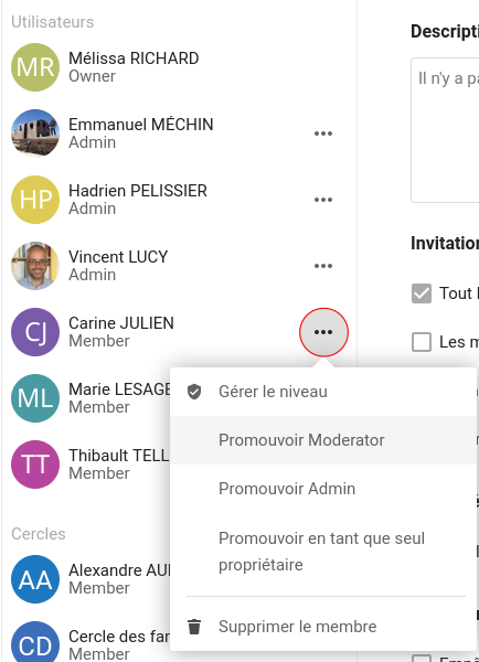 Les membres peuvent aussi inviter : les membres ont la possibilité d'inviter d'autres utilisateur⋅ices dans le Cercle (sans passer par un⋅e modérateur⋅ice).