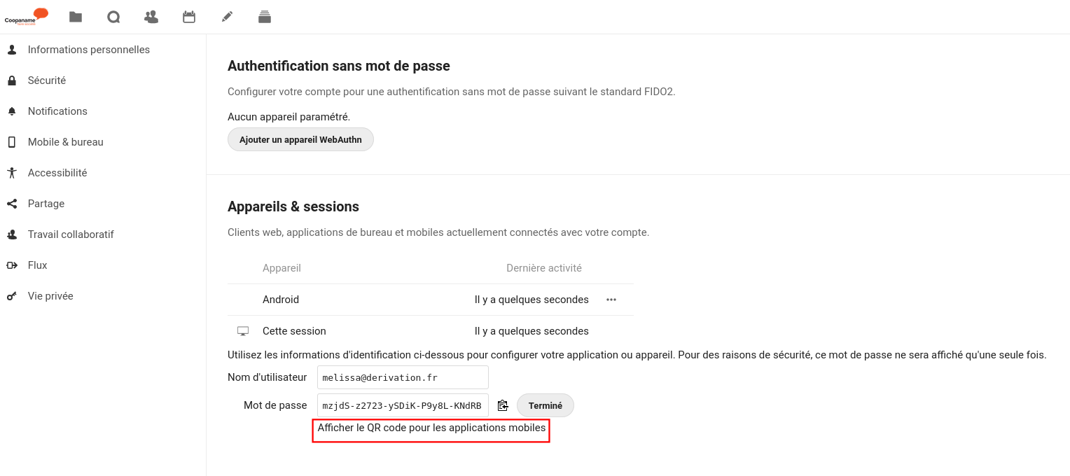 Cliquez sur "Afficher le QR code pour les applications mobiles", sous les identifiants qui viennent d'être générés.