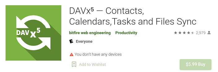 - DAVx5 est gratuit quand il est installé depuis le magasin d'applications F-droid et payant depuis les autres magasins d'applications, afin de soutenir ce projet open source.
