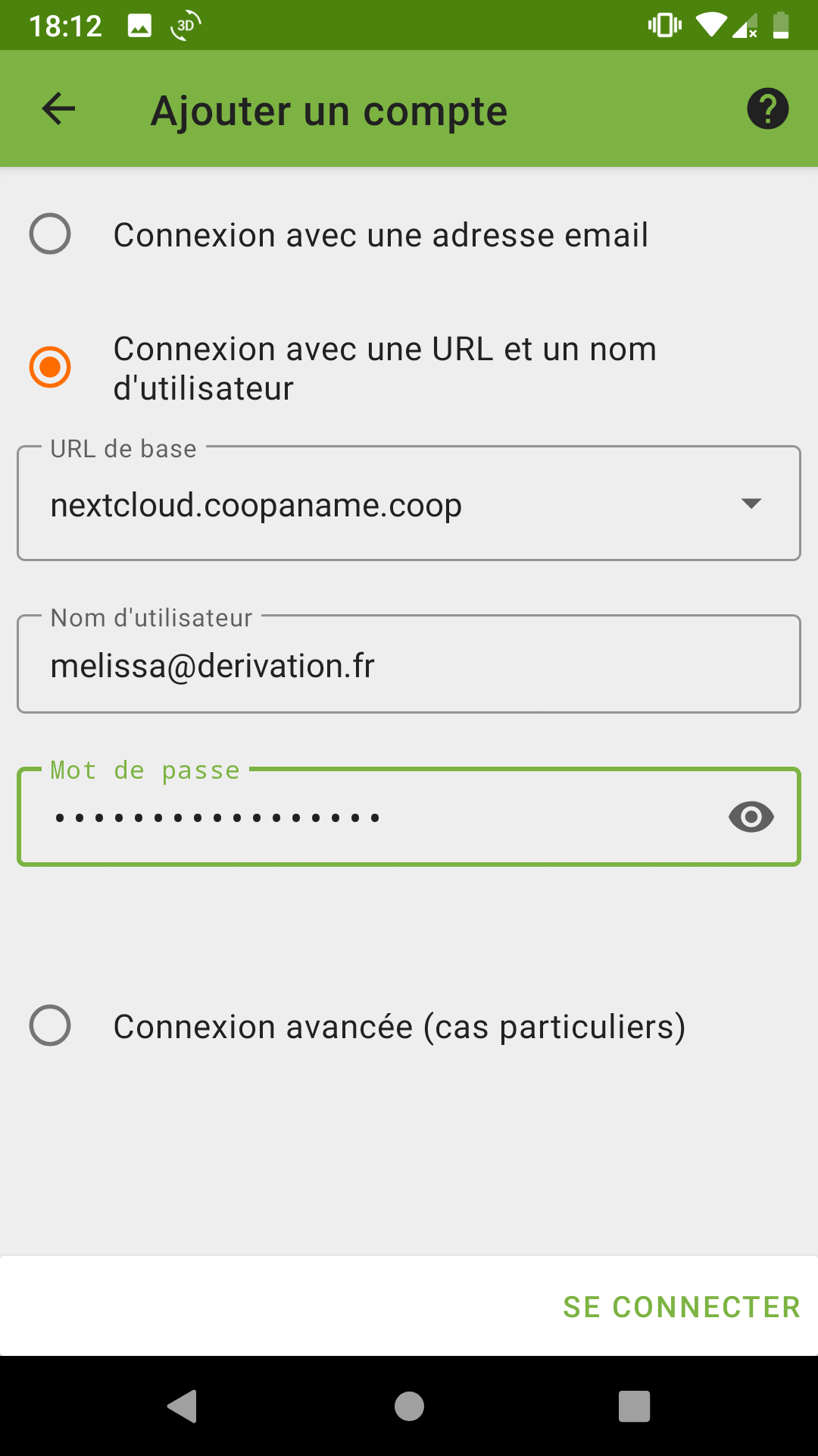 Choisissez "Connexion avec une URL et un nom d'utilisateur", entrez vos informations de connexion au Nextcloud de Coopaname et cliquez sur "Se connecter" en bas à droite.