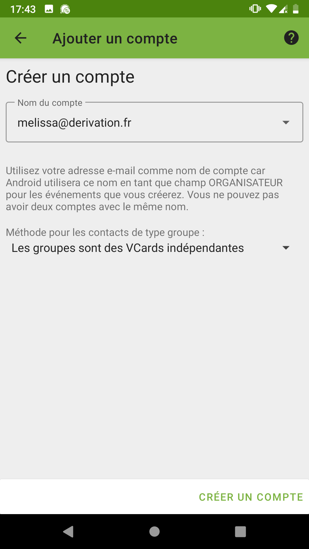 ℹ️ Pour que les contacts et les événements sur votre mobile apparaissent dans votre espace Nextcloud, créez ou copiez-les sur le compte Davx désormais proposé dans votre application de contact ou de calendrier.