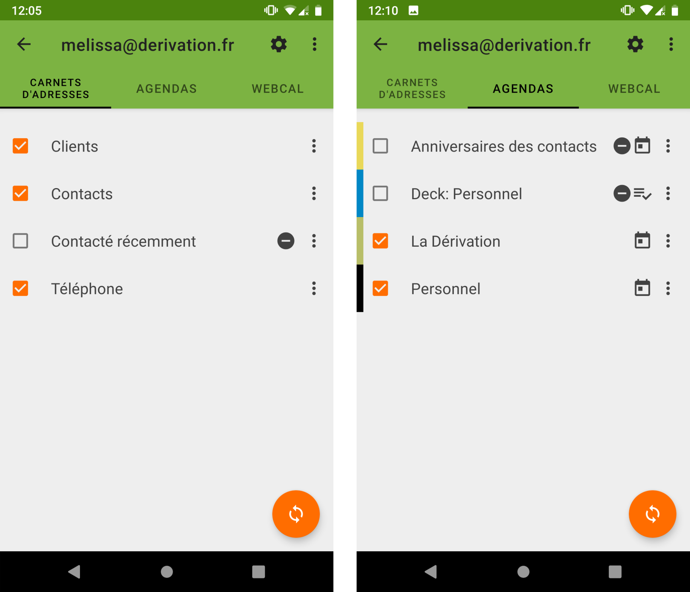 Dans les onglets correspondants, cochez les carnets d'adresse et les agendas Nextcloud que vous souhaitez ajouter à vos applications mobile de contacts et de calendrier.